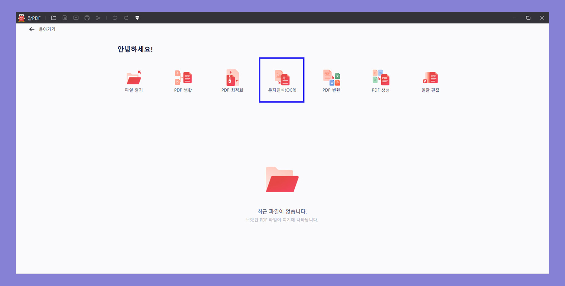 3. 알PDF 메인화면에서 문자인식(OCR)을 클릭한 후 TEXT를 추출할 PDF파일을 연다.