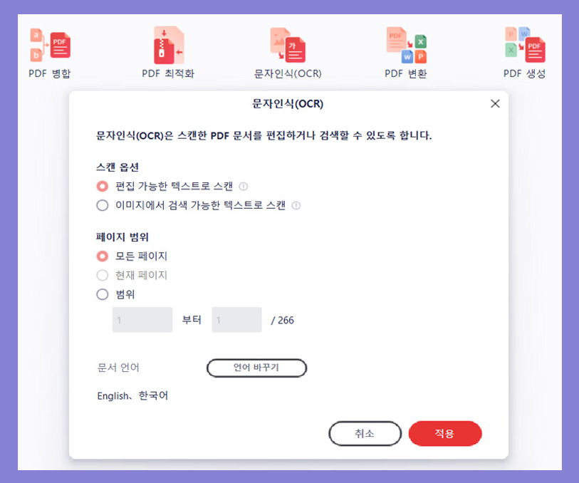 5. 스캔옵션을 선택했다면 다음은 '언어 바꾸기' 기능이다. 알PDF에서 지원되는 23개의 언어로 변환이 가능하다.